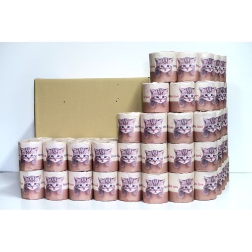 可愛い子猫の包装紙とロール本体に猫の足跡がプリントされたトイレットペーパー